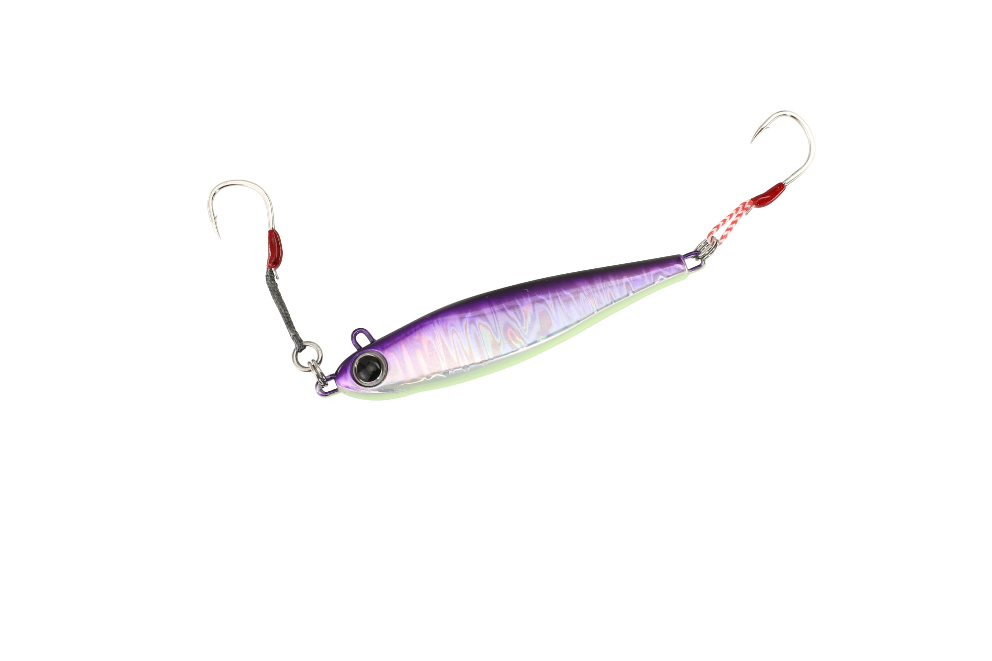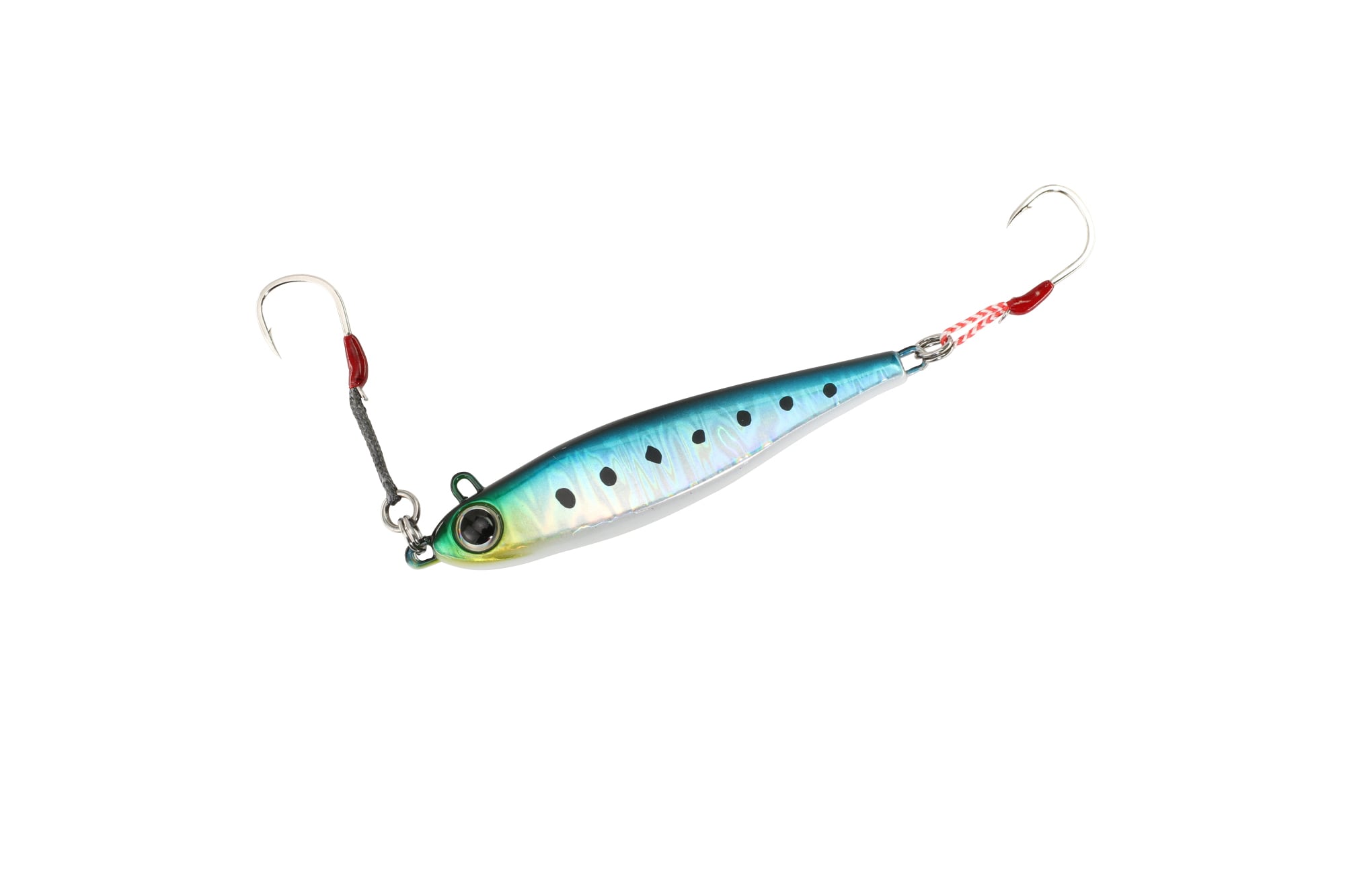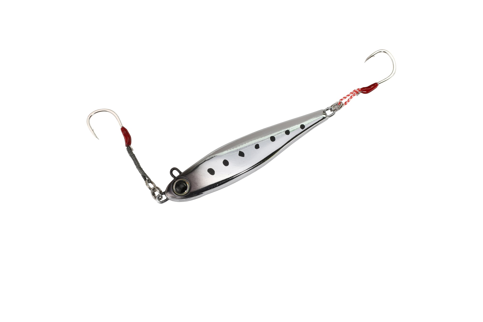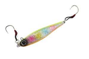 スイッチライダーは比重の軽い亜鉛系素材を使用したメタルジグ。ヘッド部とフロント部アイを配置した。取り付け位置をスイッチすることで、自然なスイミングからウォブリングまで1本で2通りの演出が可能です。