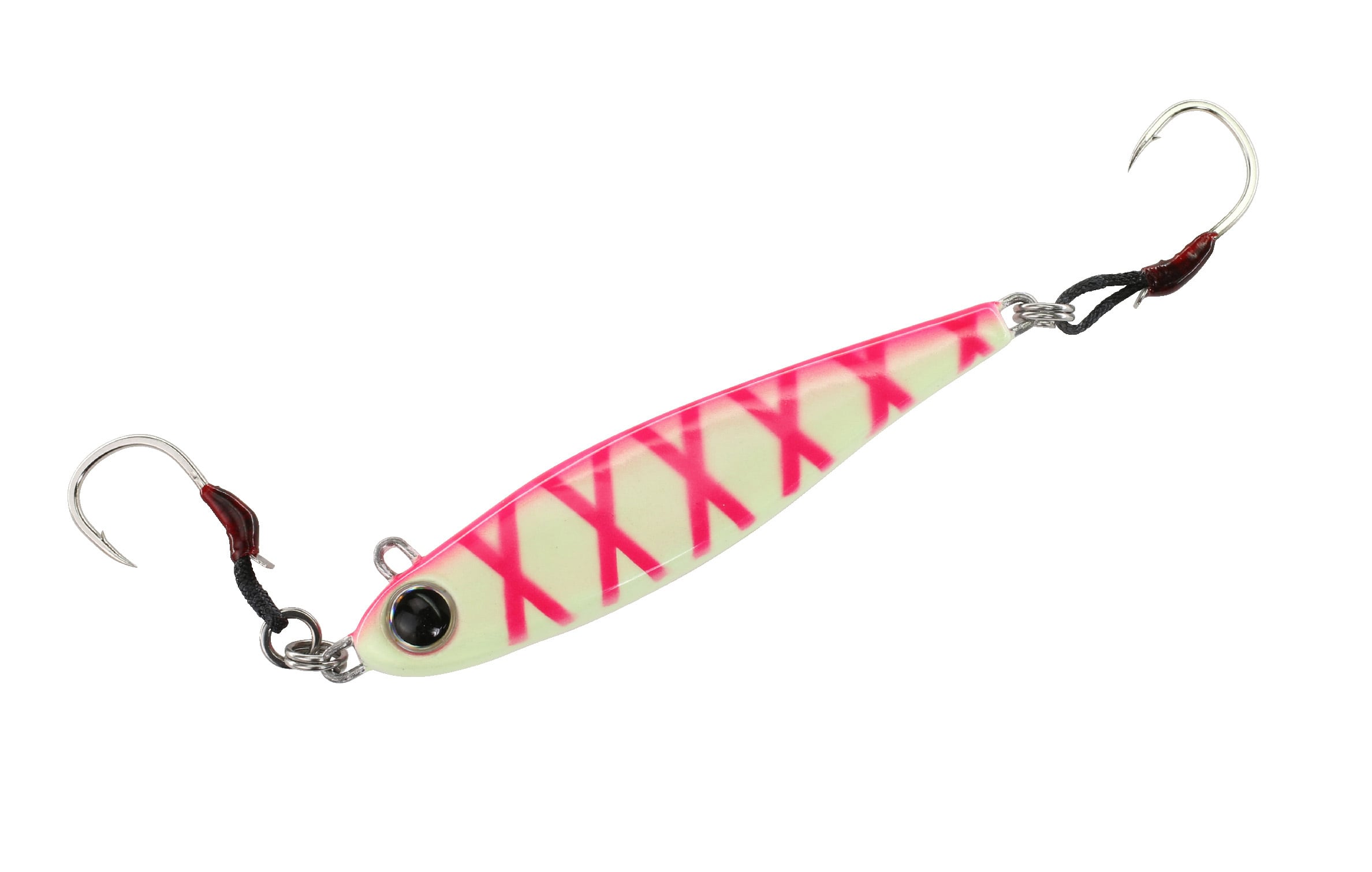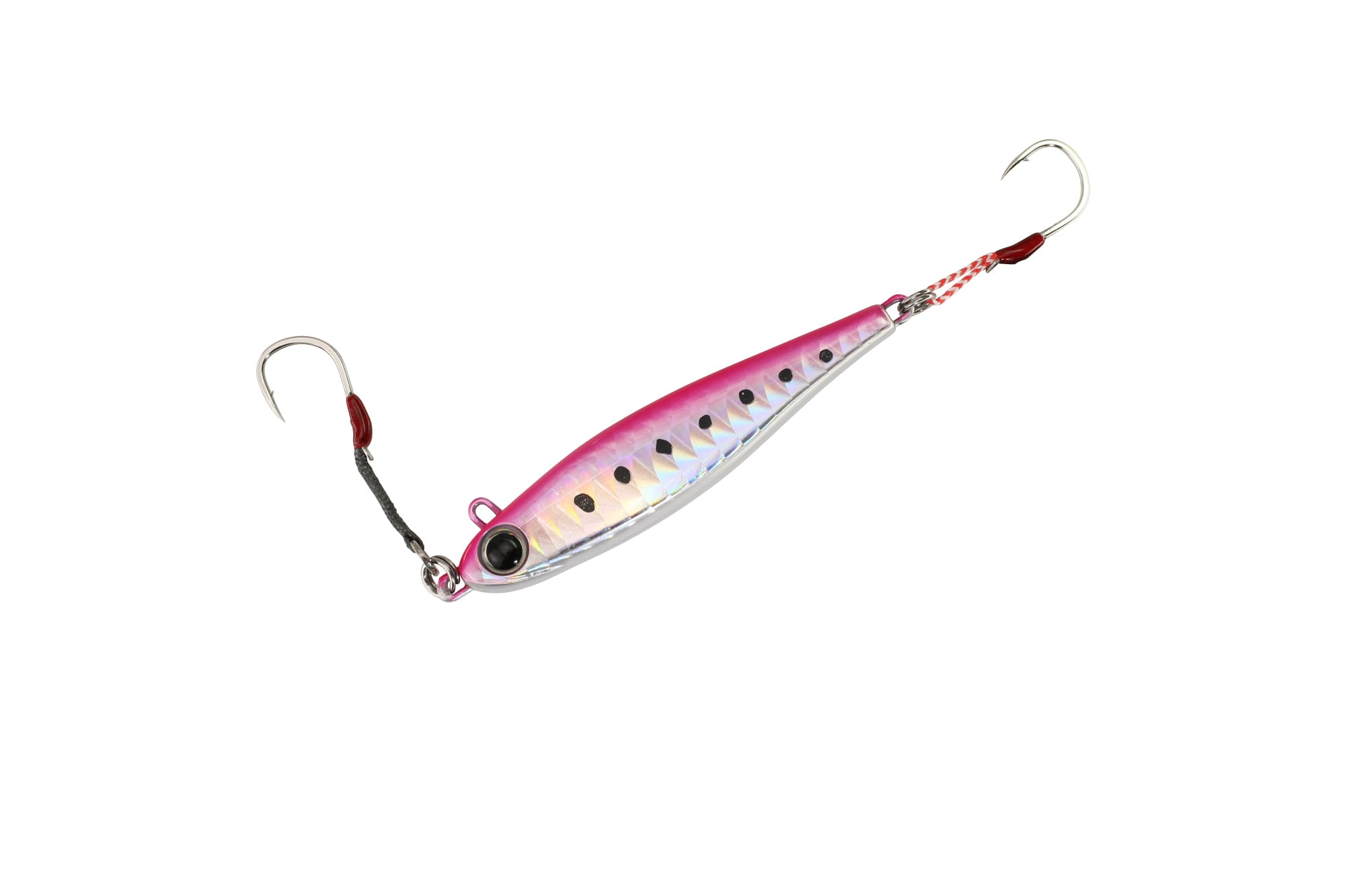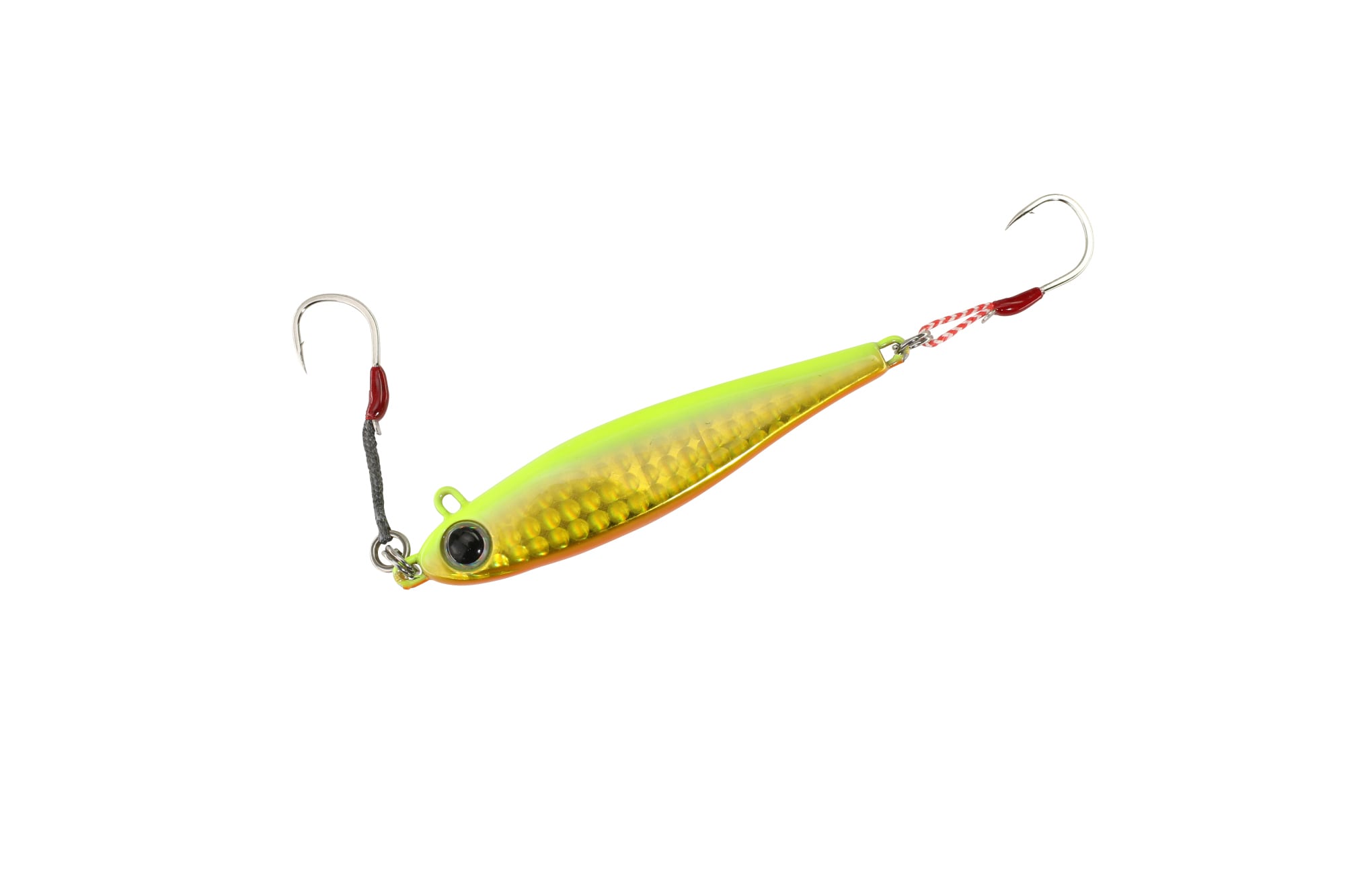 スイッチライダーは比重の軽い亜鉛系素材を使用したメタルジグ。ヘッド部とフロント部アイを配置した。取り付け位置をスイッチすることで、自然なスイミングからウォブリングまで1本で2通りの演出が可能です。